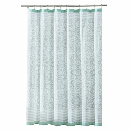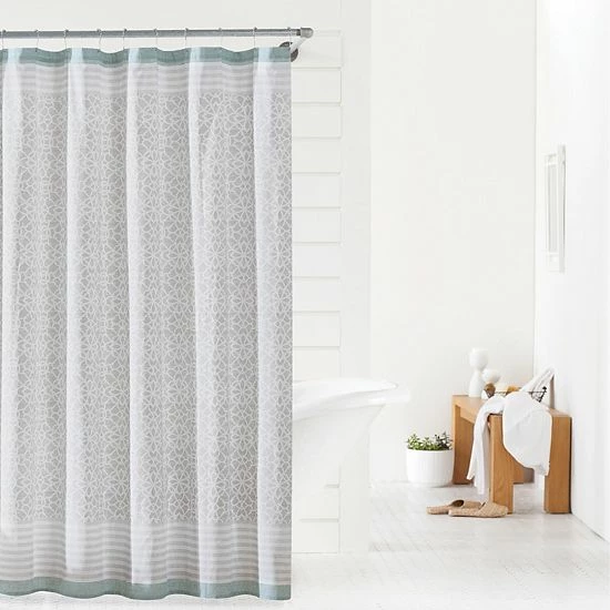 - This elegant shower curtain is perfect for any bathroom decor. It features a stunning geometric design in gray and white with striped top and bottom edges.