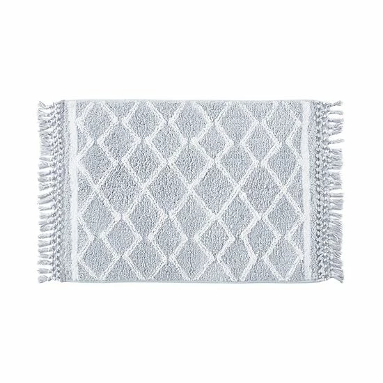 - This beautiful bath rug is the perfect addition to any bathroom or kitchen decor. It features a white diamond pattern and frilled edges with a gray background.